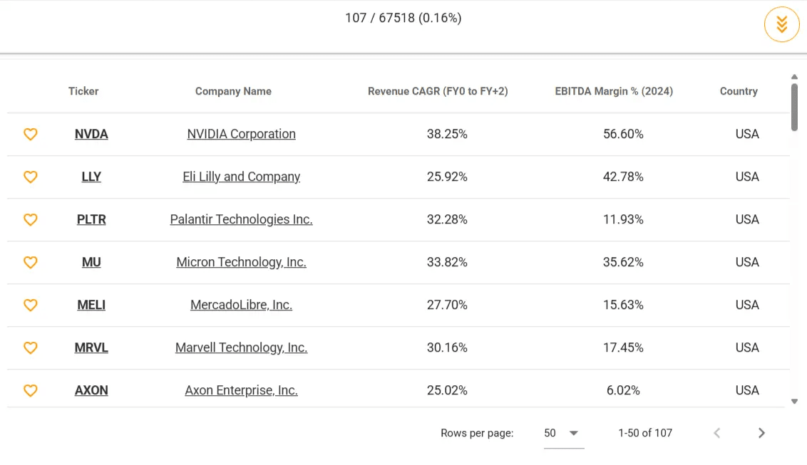 Você pode filtrar o crescimento futuro da receita e dos ganhos, a melhoria das margens e a forte eficiência de capital. Esses filtros o ajudam a identificar empresas com dinamismo e escalabilidade.
