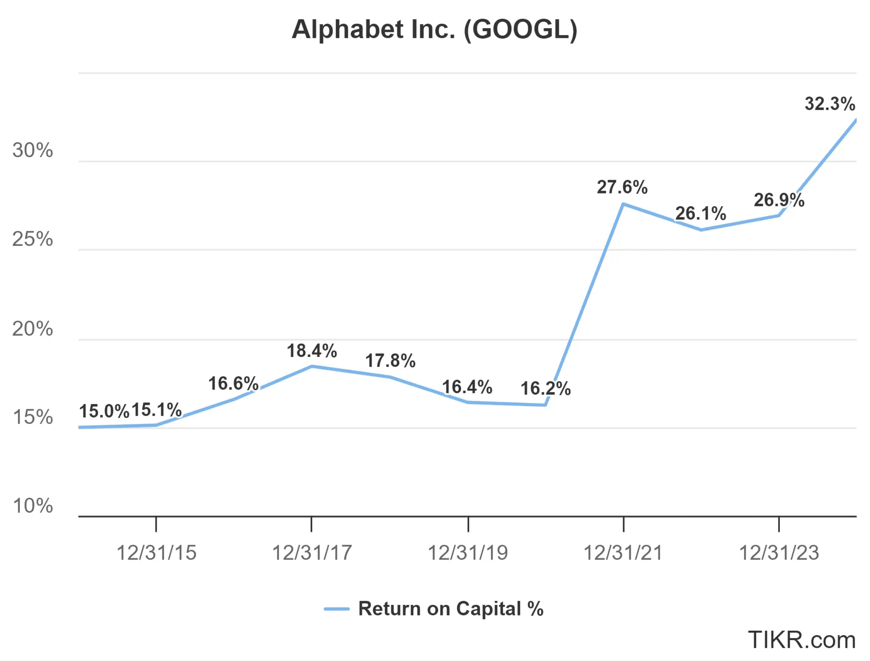 Desde 2021, o ROIC da Alphabet aumentou para atingir 32,3% em 2024, mostrando que a empresa melhorou drasticamente sua capacidade de gerar lucro a partir de sua base de capital devido a margens mais fortes, controle de custos mais rígido e investimentos de alto retorno.