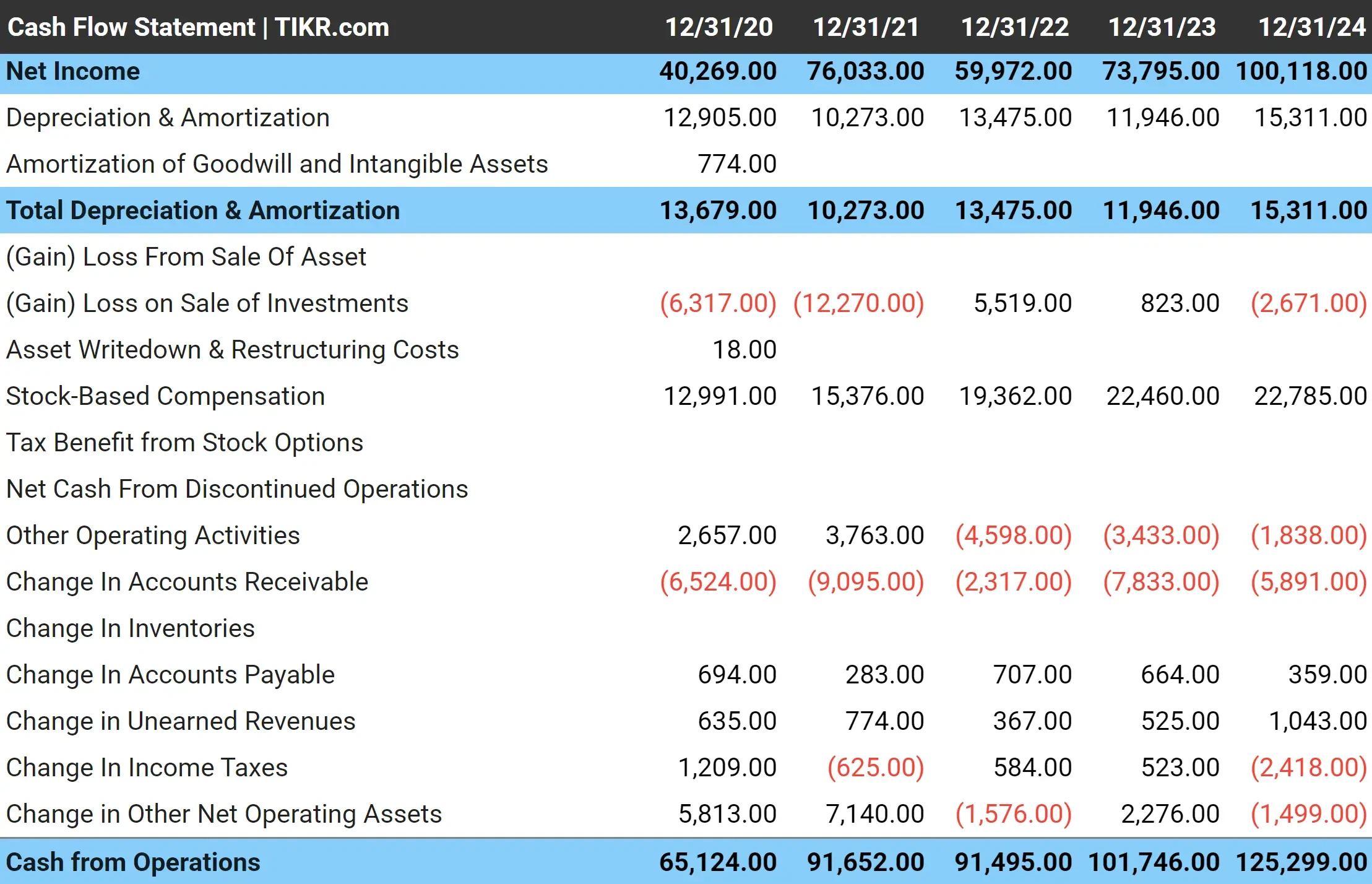 Conforme mostrado abaixo, o caixa das operações da Alphabet tem excedido consistentemente seu lucro líquido ajustado mais depreciação e amortização nos últimos 5 anos. Isso indica uma alta qualidade dos lucros.