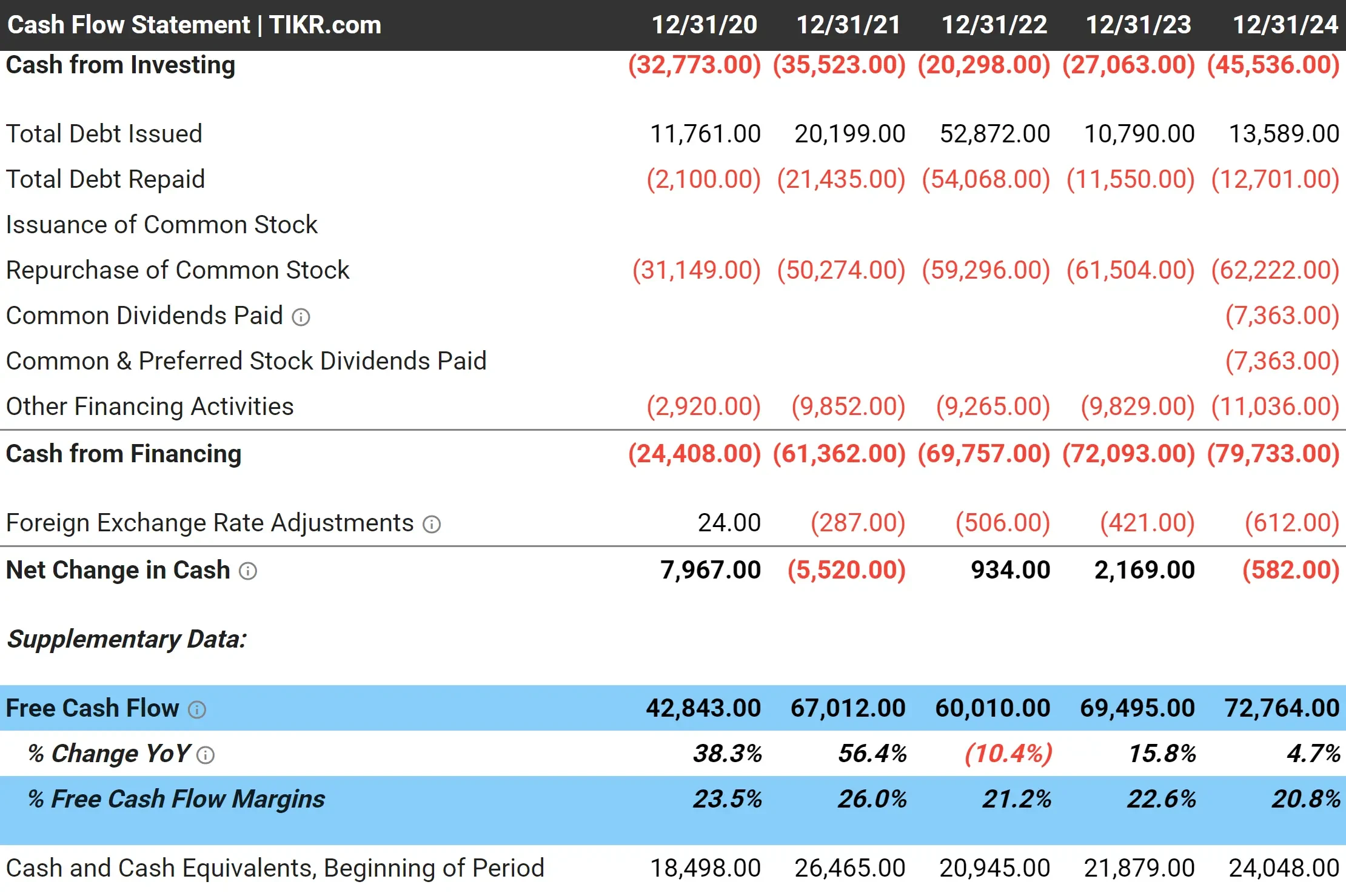 A Alphabet tem mantido margens de FCF saudáveis ao longo do tempo, consistentemente acima de 20%. Mesmo durante anos de crescimento mais lento, como 2022, a margem FCF se manteve em 21,2% e, em 2024, atingiu 20,8% em quase US$ 73 bilhões de FCF, refletindo uma eficiência operacional duradoura e gastos de capital disciplinados.