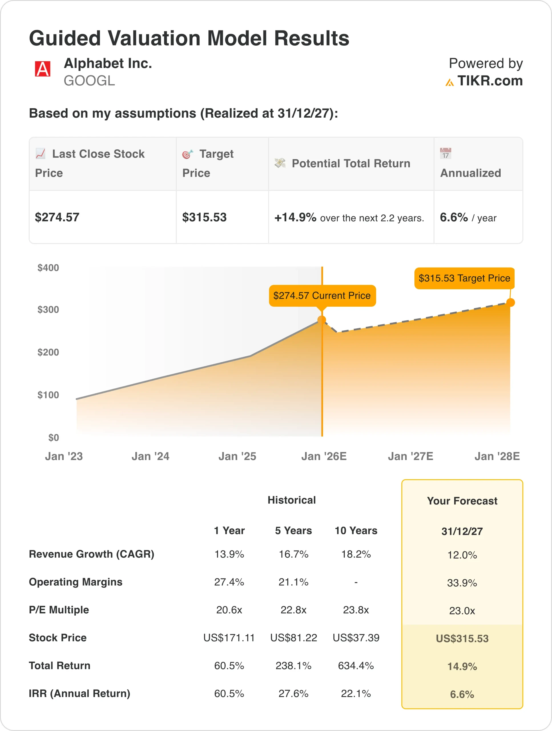A partir daí, o TIKR calcula o preço potencial das ações e os retornos totais nos cenários de alta, base e baixa, para que você possa ver rapidamente se uma ação parece subvalorizada ou supervalorizada.