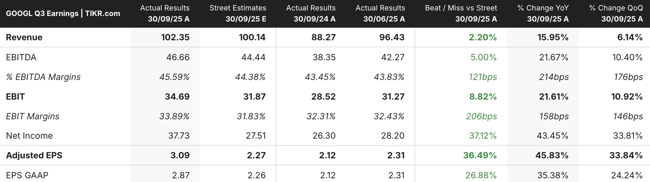 A receita de publicidade do YouTube foi de US$ 10,26 bilhões, superando o consenso de US$ 10,01 bilhões. O principal aplicativo Gemini AI do Google agora possui mais de 650 milhões de usuários ativos mensais, acima dos 450 milhões do último trimestre, embora ainda esteja atrás dos 800 milhões de usuários semanais do ChatGPT.