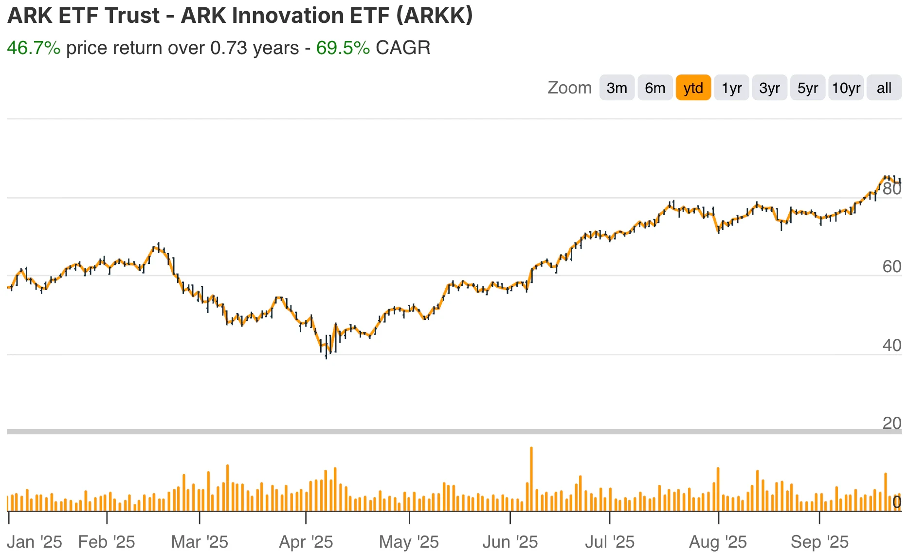 A carteira também se inclina para setores que os ETFs tradicionais mal tocam: edição de genes, ativos digitais, tecnologias imersivas e comércio de última geração. Isso confere ao ARKK um perfil exclusivo em comparação com fundos como QQQ ou SPY. Os investidores que buscam exposição a empresas disruptivas em estágio inicial não encontrarão muitos desses nomes em outros lugares.