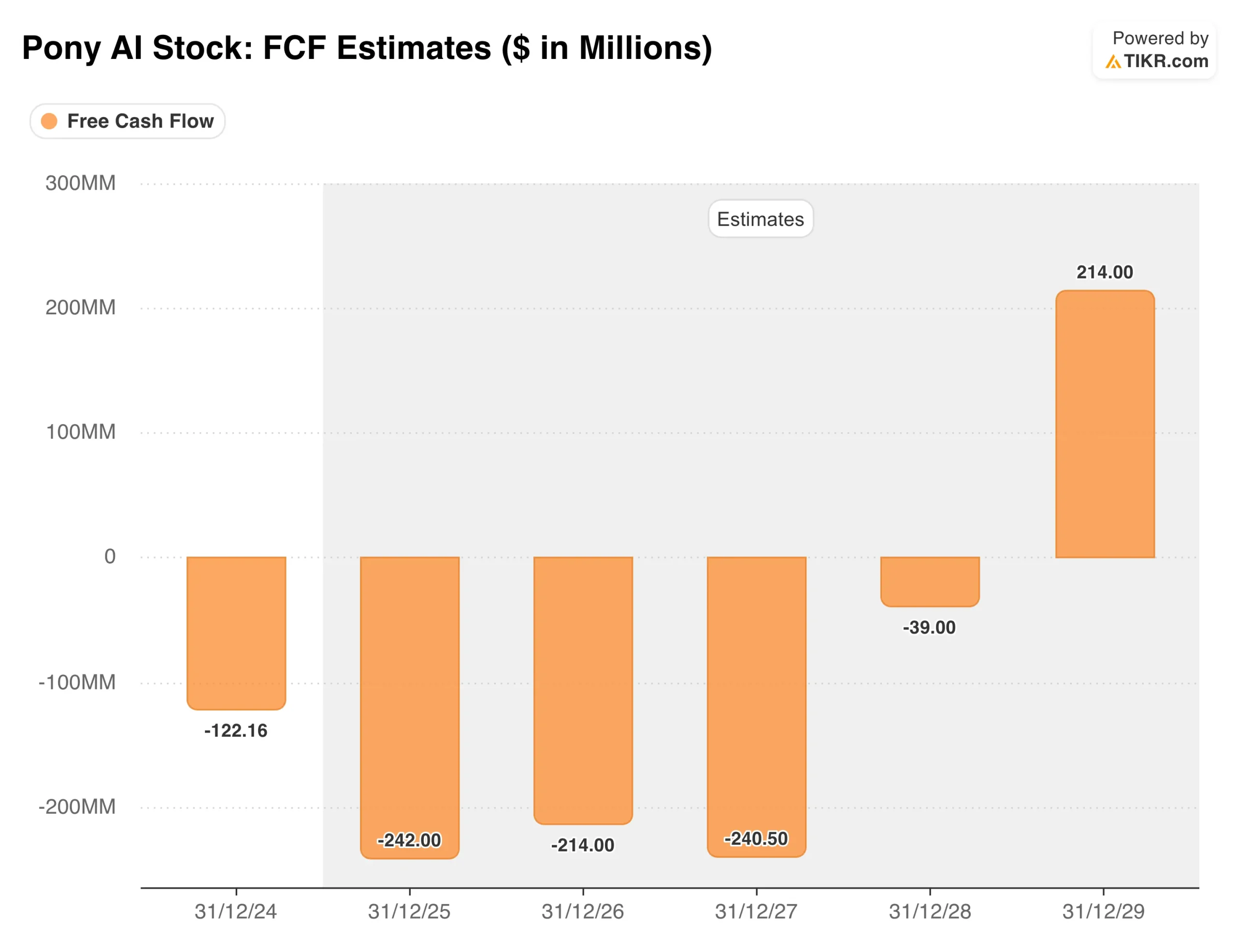 A receita de cobrança de tarifas, a parte do negócio que mostra tração comercial real, cresceu mais de 300%. Embora as ações da Pony AI não sejam lucrativas no momento, a previsão é que terminem 2029 com um fluxo de caixa livre de US$ 214 milhões.