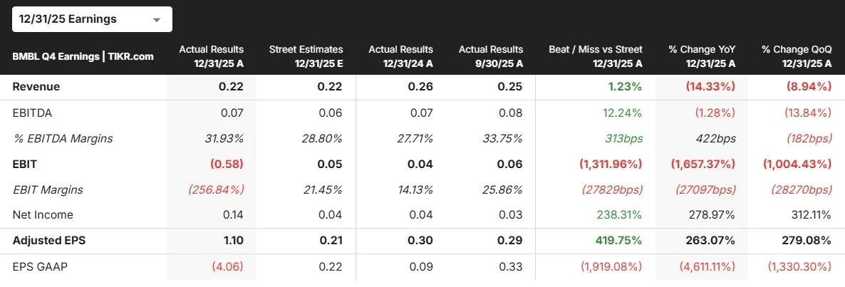 As açõesda Bumble(BMBL) estão subindo hoje, depois que a empresa apresentou uma batida nos lucros do quarto trimestre e emitiu uma orientação melhor do que a esperada para o primeiro trimestre - dando aos investidores o primeiro sinal real de que sua reviravolta está começando a funcionar.