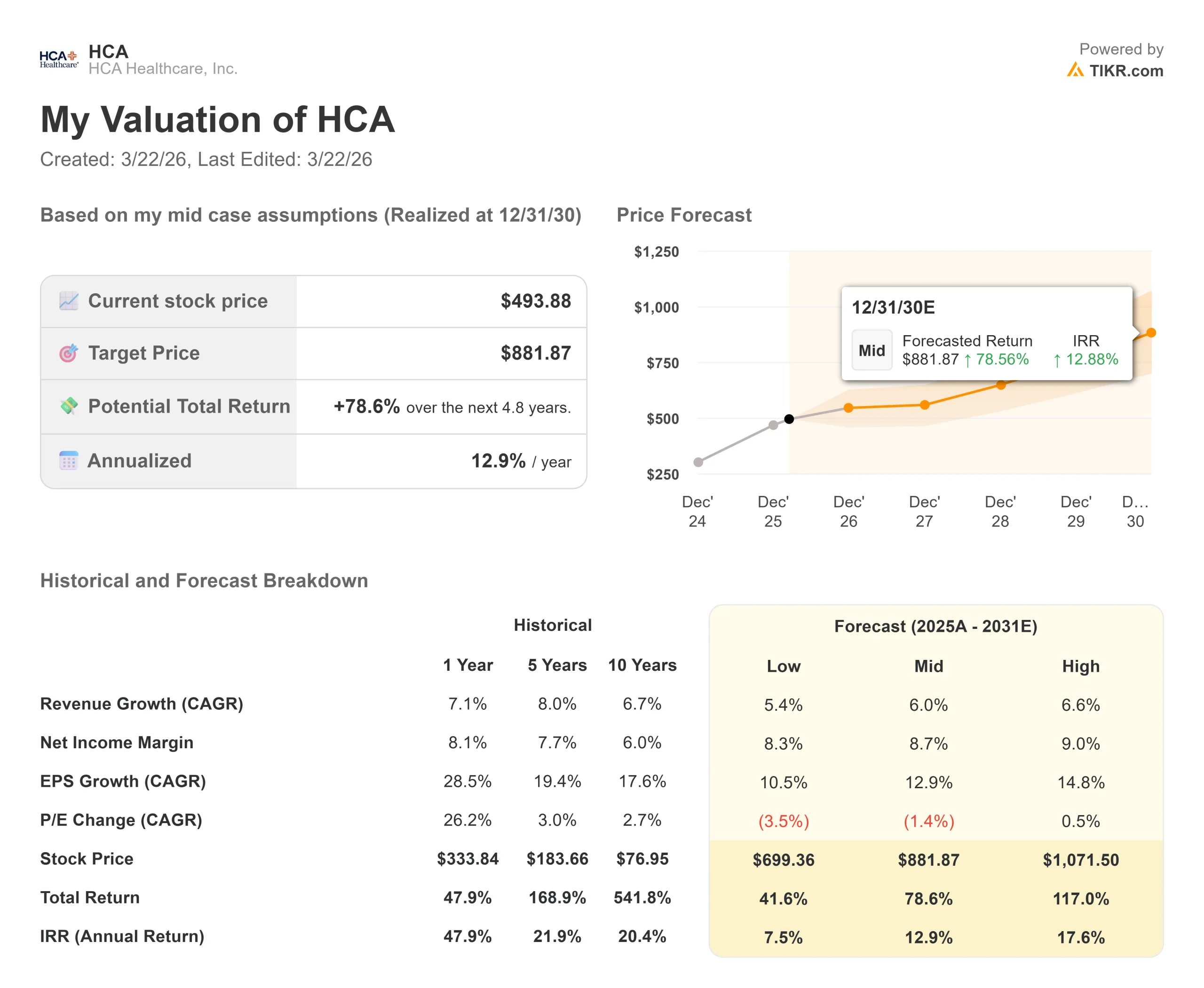 O modelo Mid Case projeta um preço-alvo altamente confiante de US$ 881,87. A alavanca de avaliação fundamental aqui é a consistência do volume; a HCA presume que gerará de forma confiável um CAGR de receita de 6,0% até o período de previsão de 2030, à medida que a população em seus principais mercados do cinturão do sol continuar a se expandir.
