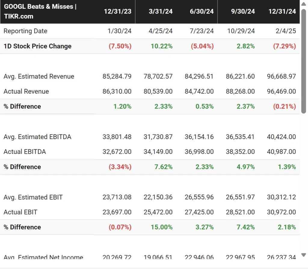 O TIKR facilita a visualização do desempenho de uma empresa com seu recurso Earnings Review. Você pode ver que, no quarto trimestre de 2024, o Google teve uma pequena perda de receita e uma ligeira superação de ganhos: