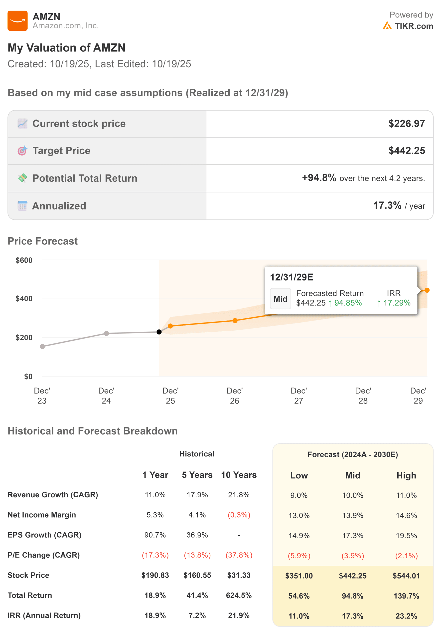 No cenário de alta mostrado abaixo, as melhorias contínuas na lucratividade e o crescimento mais forte da Amazon poderiam levar o retorno esperado para mais perto de 140% no mesmo período, o que se traduziria em cerca de 23% de retorno anual. Isso significaria um preço-alvo acima de US$ 540 se a execução e o sentimento permanecerem fortes.