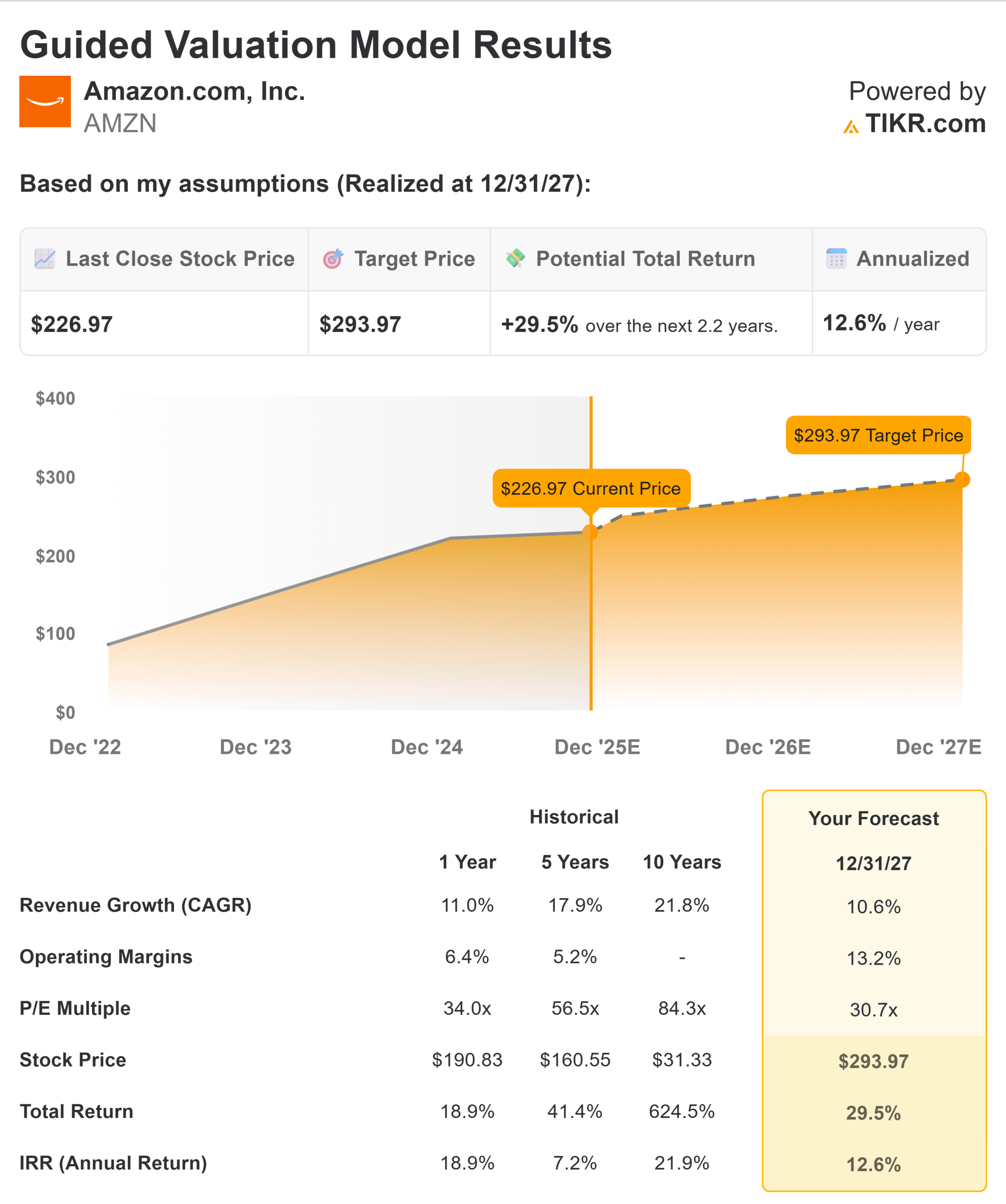 Com base em nossas premissas, o modelo estima que as ações da Amazon poderiam ter 29,5% de alta até o final de 2027 (2,2 anos), o que representaria 12,6% de retorno anualizado.