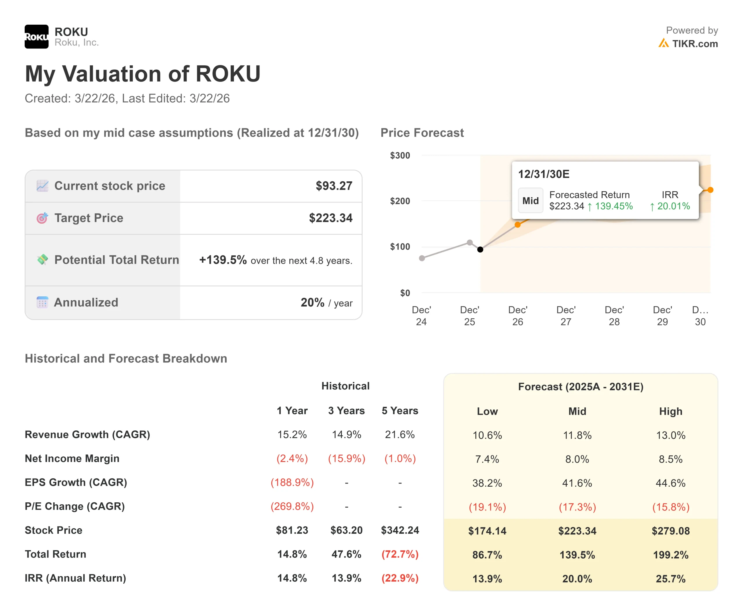 Abra a Roku e você verá anos de histórico financeiro, o que os analistas de Wall Street esperam para a receita e os lucros nos próximos trimestres, como os múltiplos de avaliação se moveram ao longo do tempo e se as metas de preço estão tendendo para cima ou para baixo.