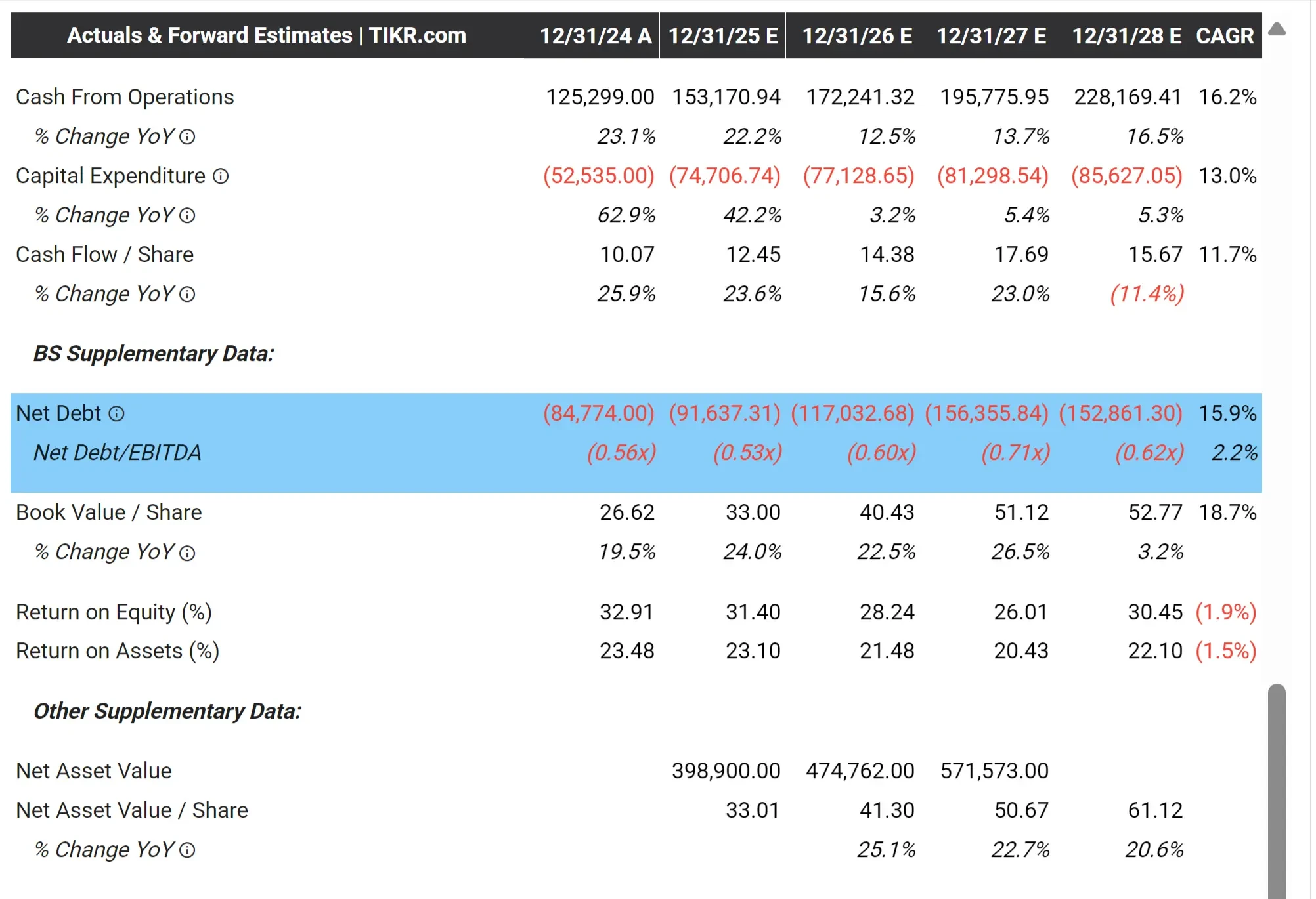 No caso do Google, o valor da dívida líquida é negativo durante todo o período da previsão, o que significa que a empresa tem uma dívida líquida negativa porque possui mais caixa do que dívida. Os analistas estimam que a dívida líquida permanecerá abaixo de zero até 2028, e o índice de dívida líquida em relação ao EBITDA permanece profundamente negativo em todos os anos. Em 2024, o índice é estimado em -0,56x e permanece abaixo de -0,7x na maior parte do horizonte da previsão.