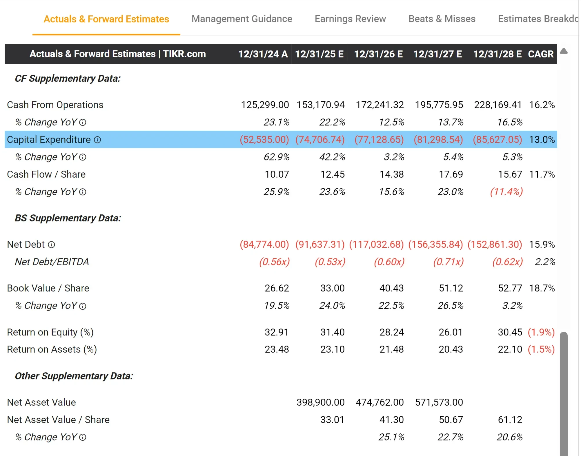 Para o Google, os analistas estão prevendo aumentos constantes no CapEx, passando de cerca de US$ 52,5 bilhões em 2024 para mais de US$ 85,6 bilhões em 2028.
