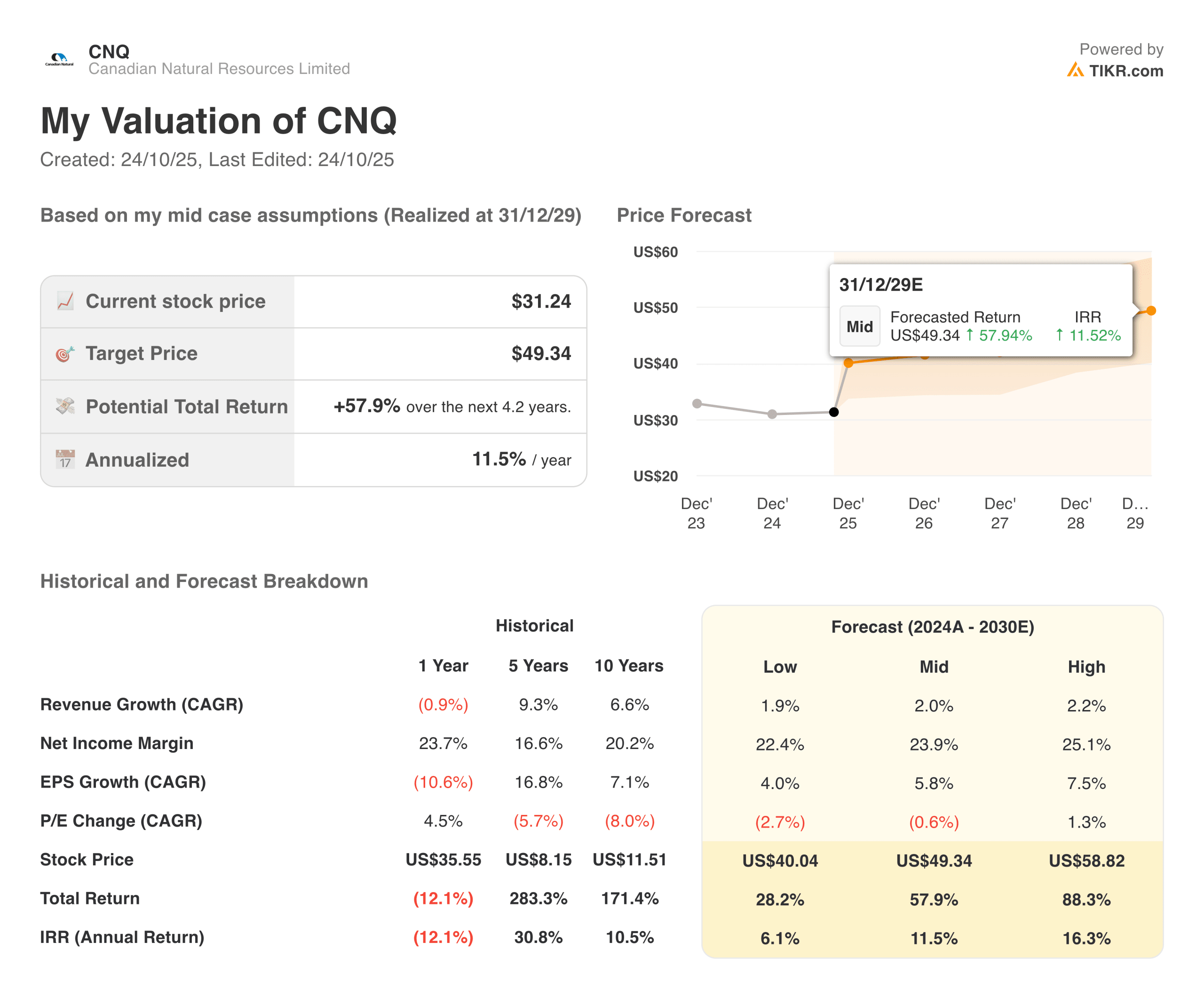 Mesmo no caso conservador, as ações da Canadian Natural Resources oferecem retornos sólidos apoiados por uma produção de baixo custo e uma capacidade comprovada de gerar fluxo de caixa livre ao longo do ciclo, mantendo as distribuições aos acionistas.