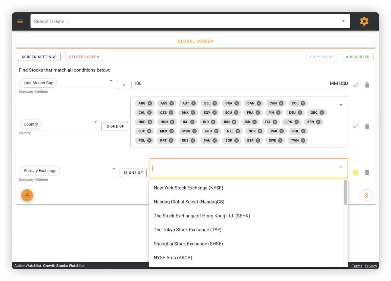 Save time by quickly sifting through the global universe of stocks. Our powerful screener covers stocks across 92 countries and 136 Exchanges.