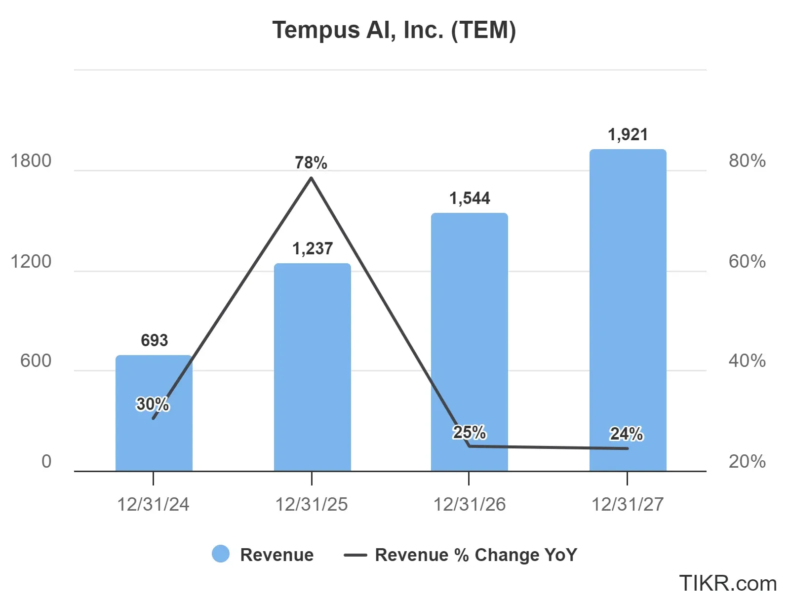 根据收入增长图,Tempus AI 预计将在未来几年经历非同寻常的增长。该公司的收入预计将从 2024 年的 6.93 亿美元增至 2027 年的 19.2 亿美元,在此期间增长 177%。