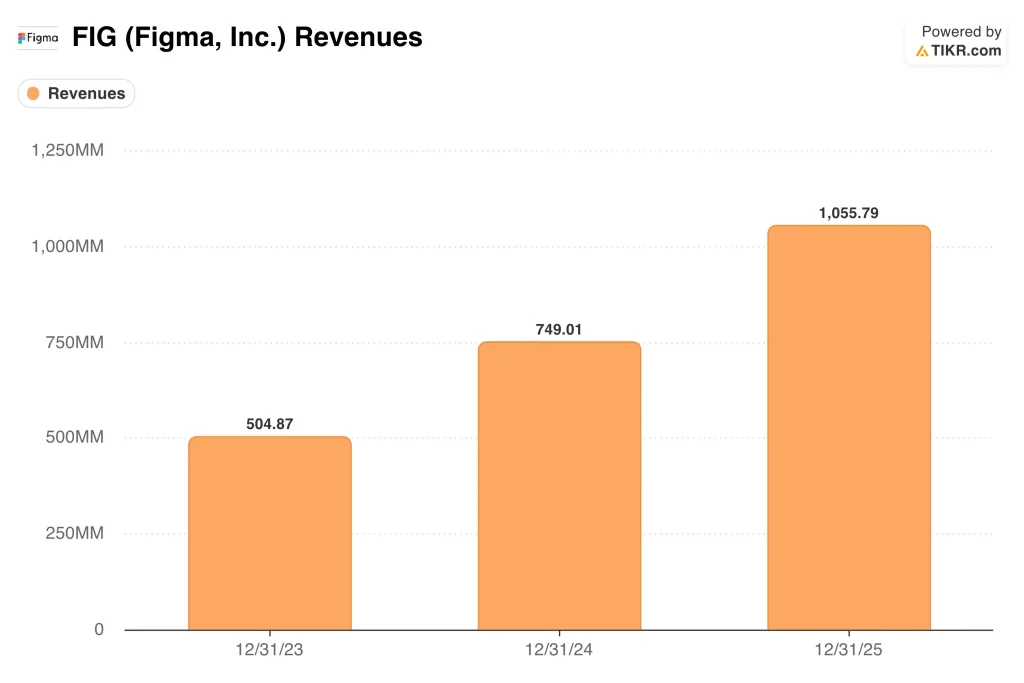 Figma 的估值仍然很复杂,因为该公司既有强劲的收入增长,又有严重的负盈利能力。2025 年,公司收入增长到 10.6 亿美元,增幅达 41%,这表明公司在企业客户中的业务持续扩张。然而,营业利润率仍为负122.2%,反映出公司在研发和销售方面投入巨大。