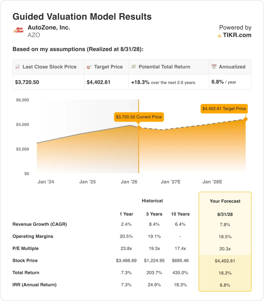 根据7.8% 的年收入增长率、18.5% 的营业利润率和20.3 倍的正常化市盈率,模型预测 AutoZone 的股价到 2028 年 8 月将从每股 3721 美元 上涨到 4403 美元 。
