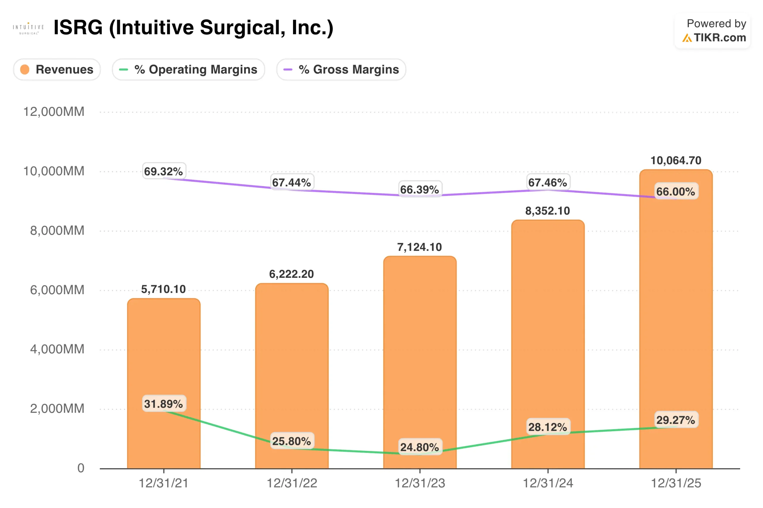 这一估值反映了该公司的优质业务和强劲的基本面。2025 年,直觉外科的收入达到 101 亿美元,同比增长 20.5%。这一增长主要得益于机器人辅助手术系统的日益普及和经常性器械销售。