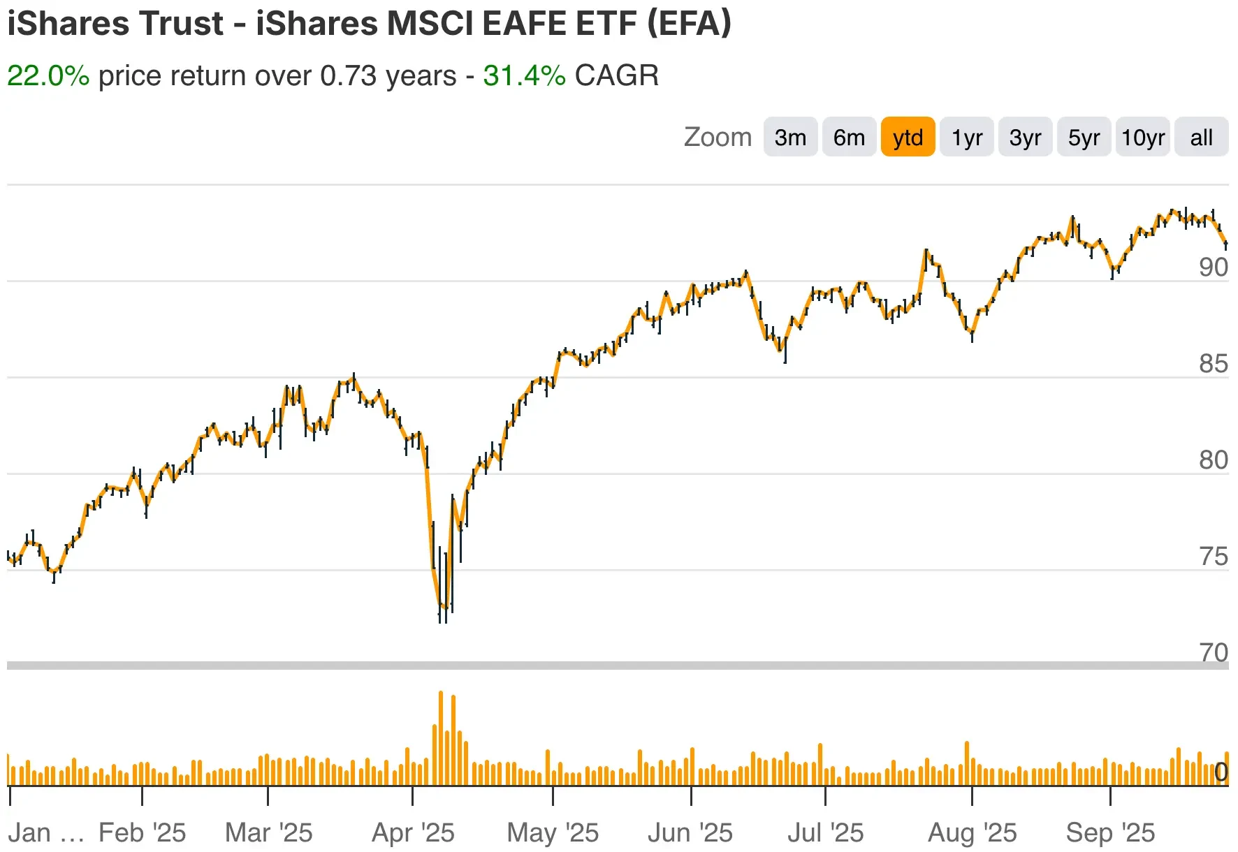 虽然该 ETF 无法免受波动的影响,但它在 2025 年以显著的一致性经受住了市场的波动。它能够从 4 月份的调整中反弹,并在 9 月份继续走高,这凸显了发达市场股票的持久性。对于寻求国际多元化而又不涉足新兴市场的投资者来说,EFA 仍然是流动性最好、最可靠的选择之一。
