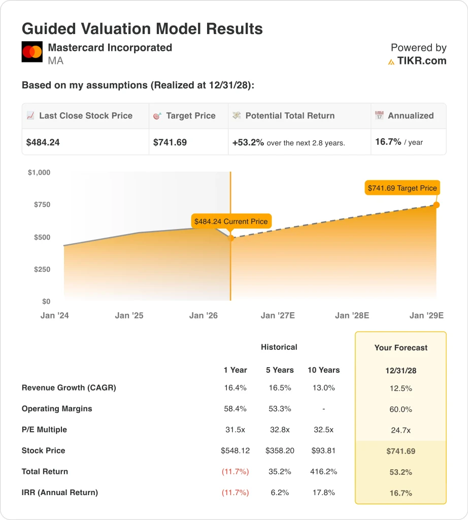 使用 TIKR 的新估值模型(免费),通过 5 年的分析师预测,对您最喜爱的股票(如 MA)进行估值 >>>