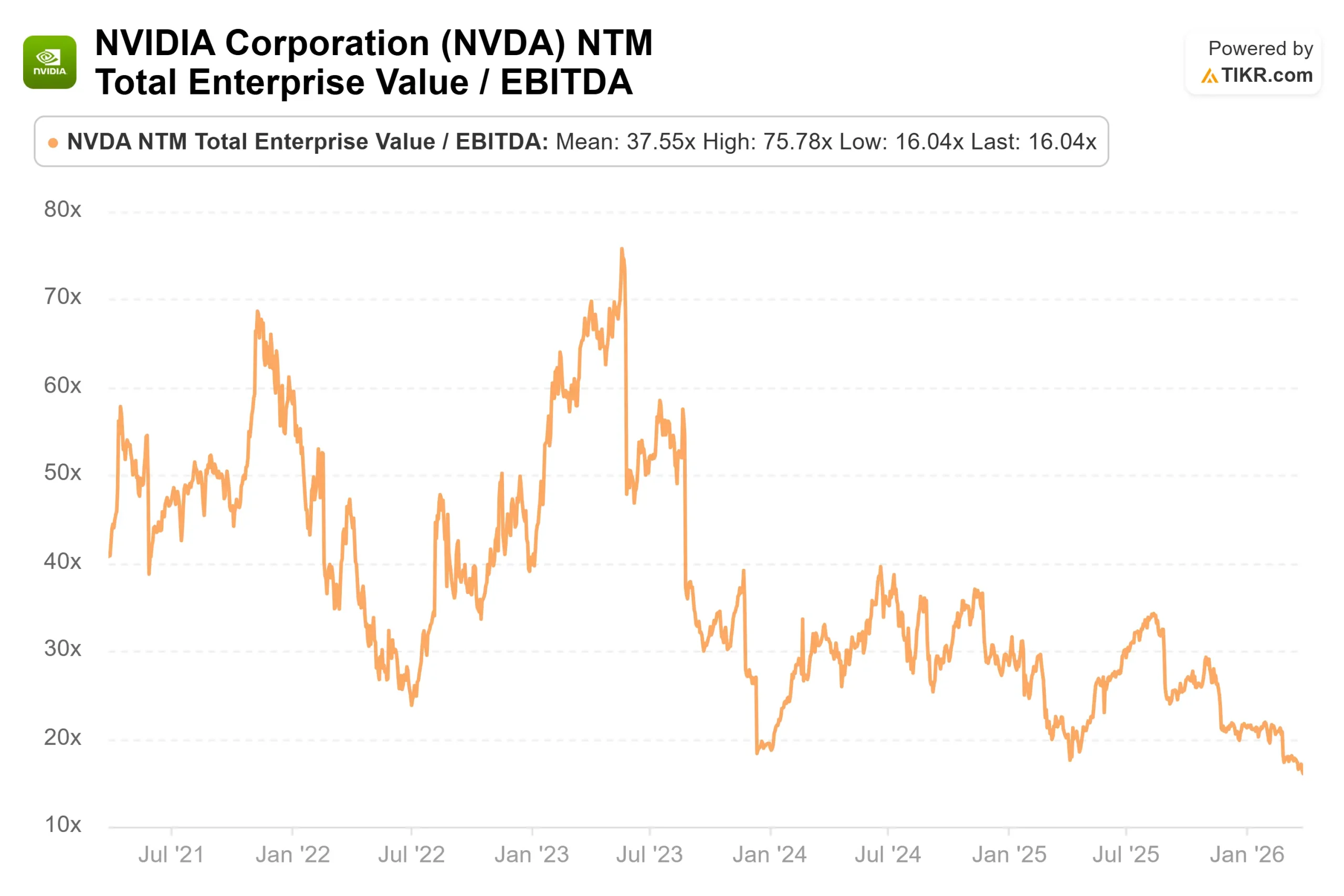 英伟达的交易价格为 16.04x,与这两家公司相比都有折扣,尽管其增长率和利润率都要高得多,LTM 毛利率为 71.1%,LTM 营业利润率为 60.4%。
