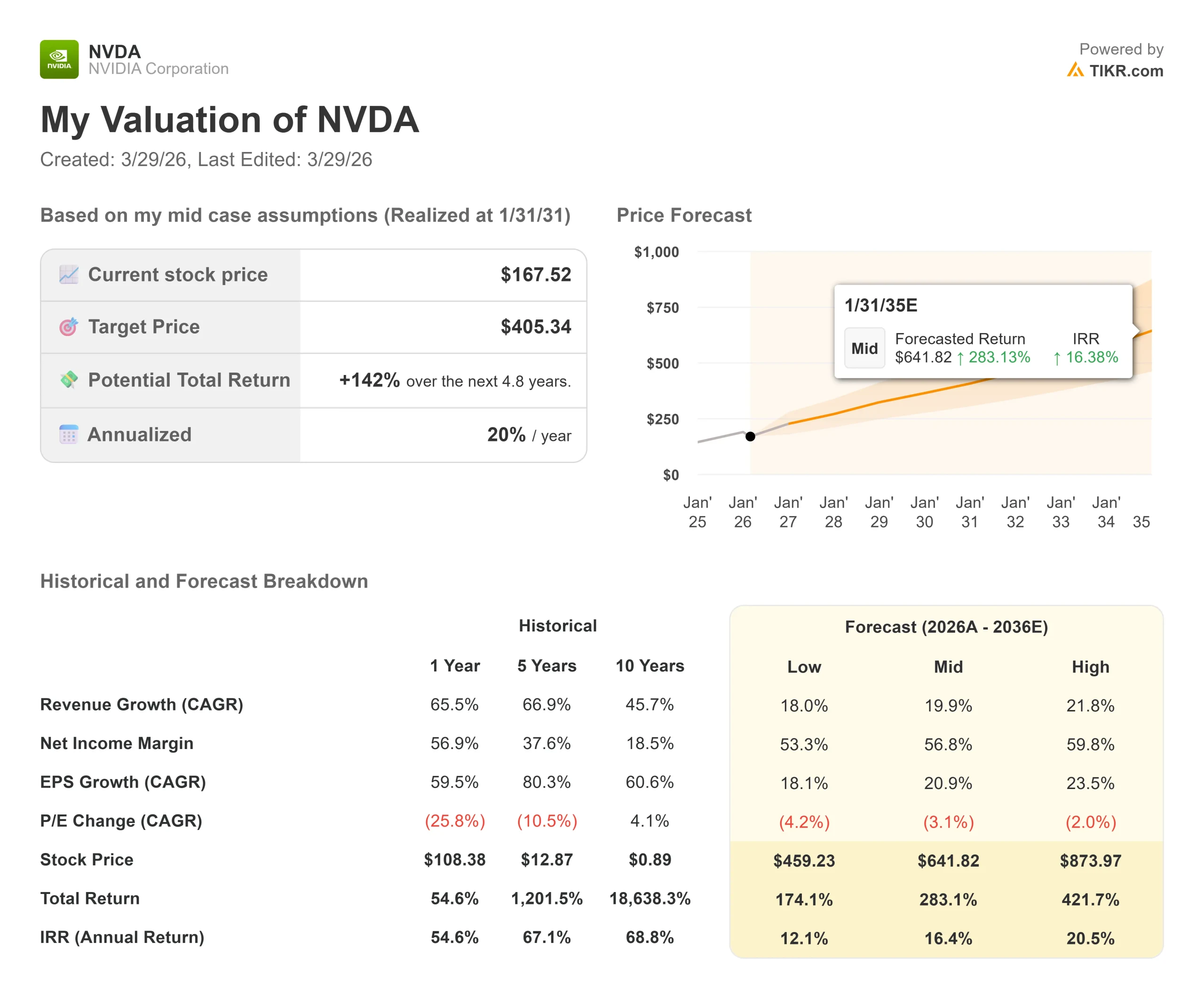 TIKR 中值模型采用了 19.9% 的营收年均复合增长率,其驱动力是数据中心计算能力的持续扩张,因为 Vera Rubin 和随后的 Feynman 架构维持了多年的升级周期,以及 CPU、基于 Groq 的推理产品和 AI 原生存储在每个新机架部署中的附加率不断扩大。利润率的驱动因素是软件和平台组合,随着利润率较高的软件收入在总销售额中所占份额的增长,中期目标的净利润率为 56.8%。中期目标价为每股 405.34 美元,将于 2031 年 1 月实现,这意味着在当前价格基础上的年化复合增长率为 20.00%。