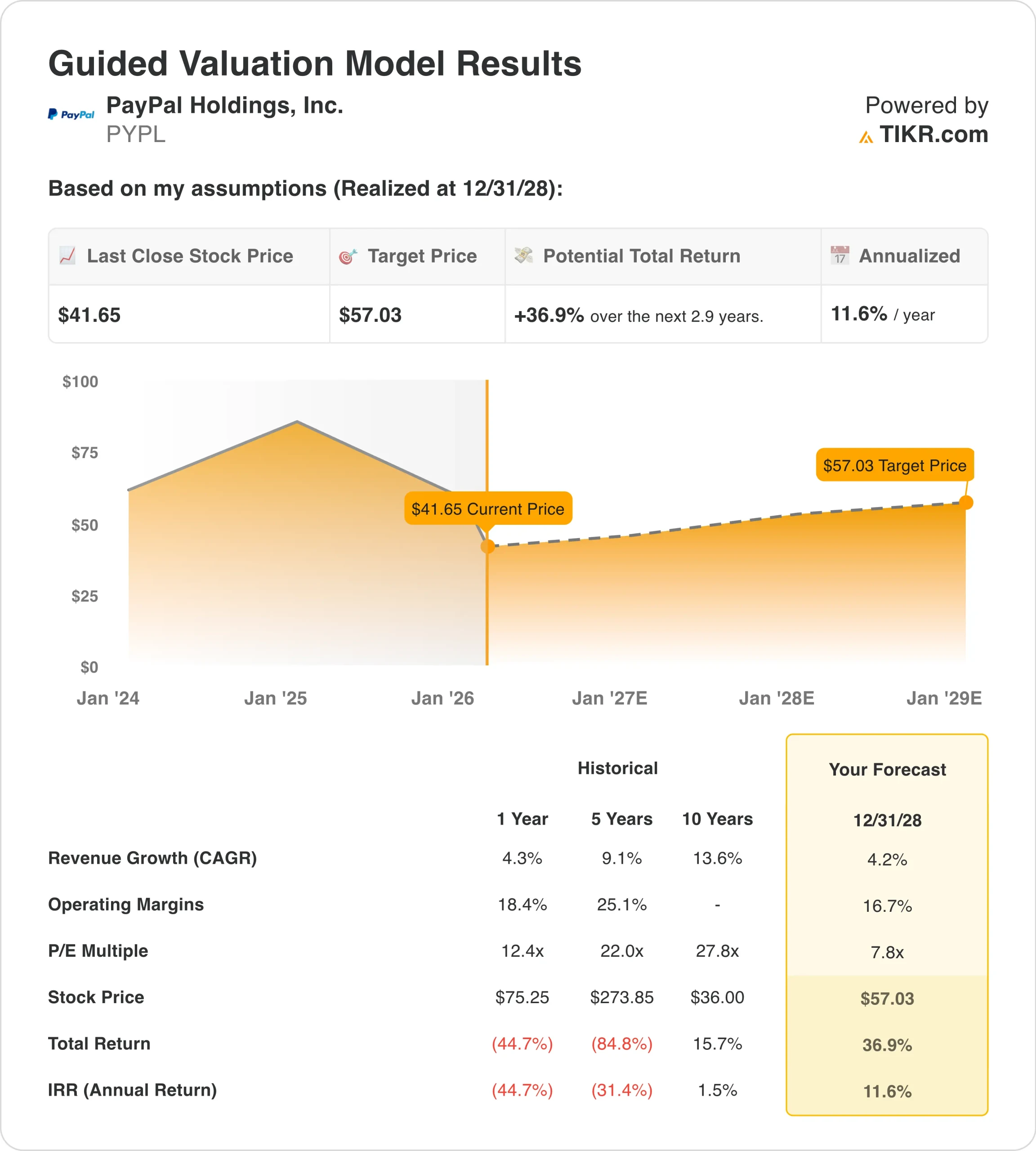使用 TIKR 的新估值模型(免费),通过 5 年的分析师预测,评估您最喜爱的股票(如 PayPal)的价值 >>>