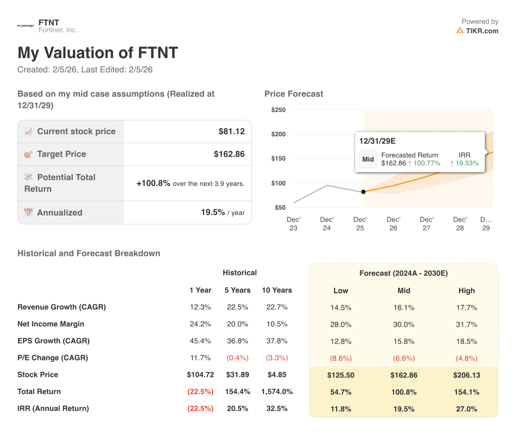 我们使用估值假设分析了 Fortinet 股票的上涨潜力,估值假设基于其强劲的历史增长、结构性高利润率,以及相对于其盈利能力概况的溢价但仍合理的估值倍数。