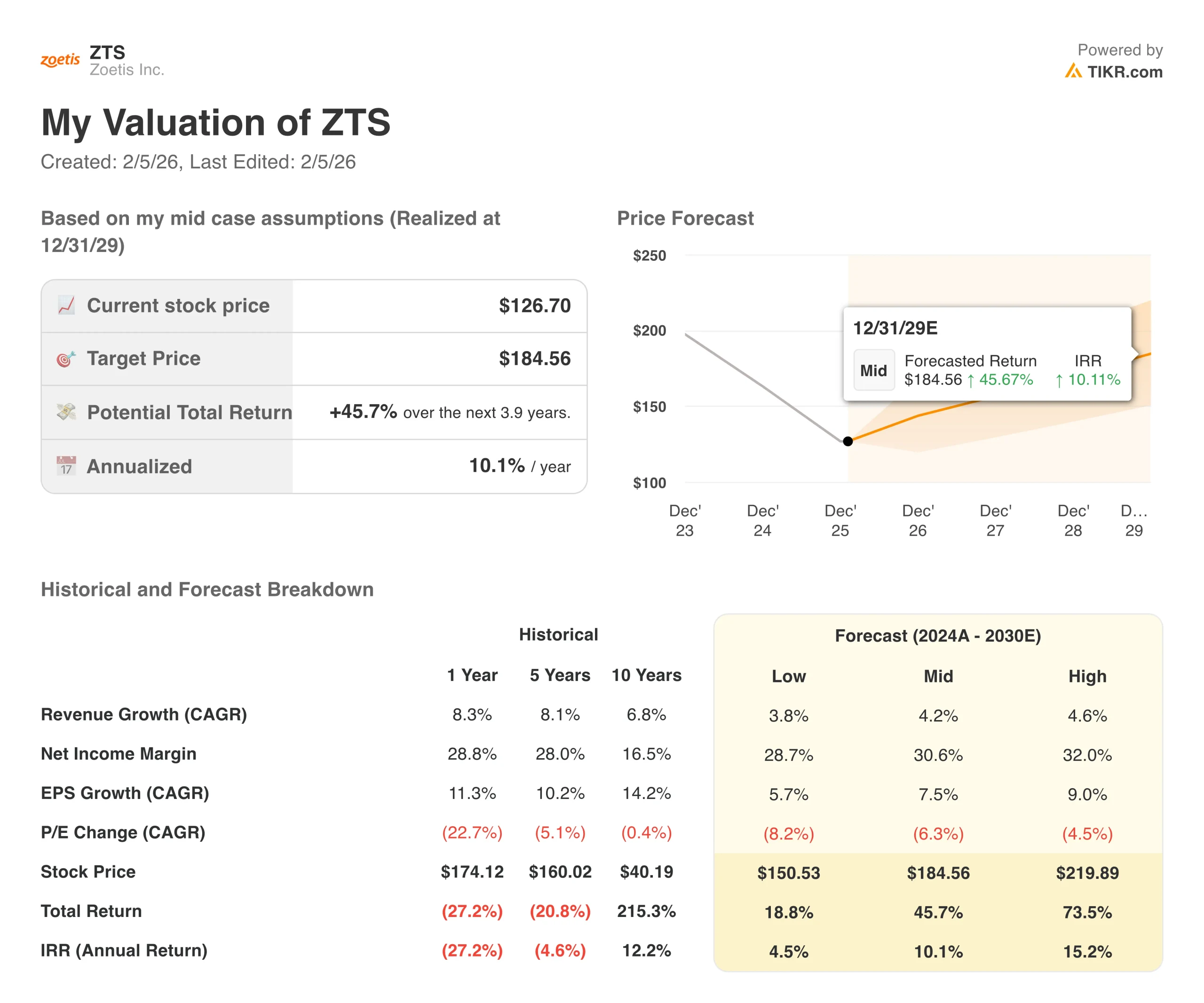 - 根据我们的估值假设,到 2030 年 12 月,ZTS 的股价有可能达到每股 185 美元。