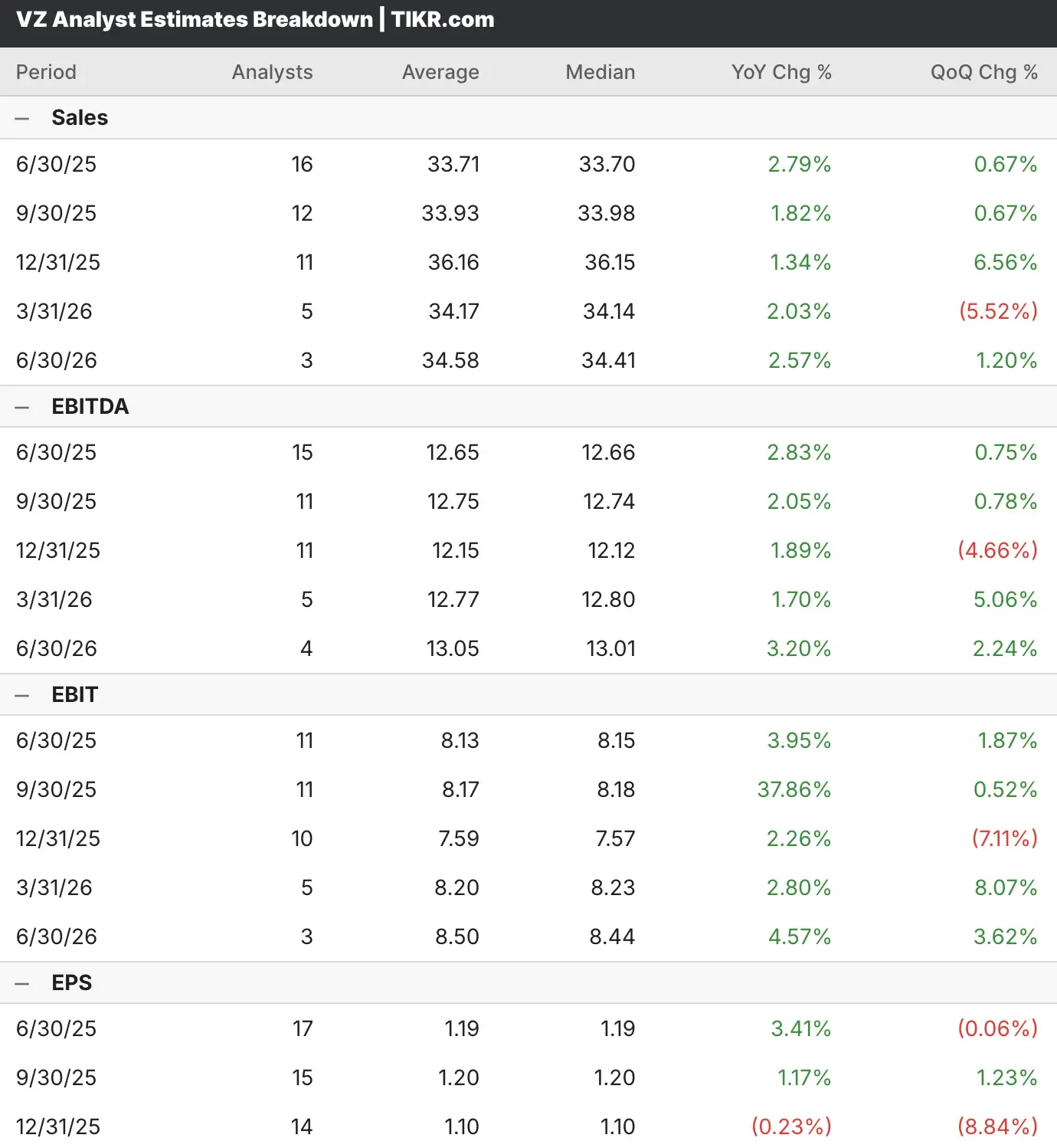 - 分析师预计,2025 年第二季度 Verizon 的营收将同比增长 2.8%,盈利将同比增长 3.4%。